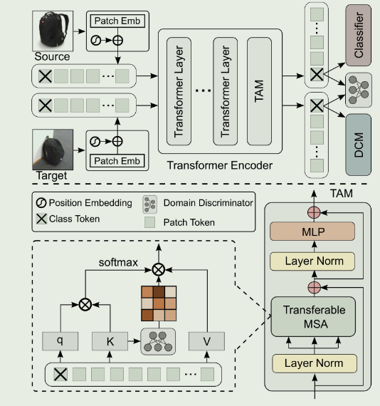 与ViT一样,源图像和目标图像都被分割成固定大小的图像块,然后线性映射并嵌入位置信息.生成的补丁送入变压器编码器,最后一层由可转让性适配模块( TAM )替换.特征学习、对抗域适应和分类由ViT-akin骨干、两个域判别器(在path-level和global-level上)、判别聚类模块( Discriminative Clustering Module,DCM )和基于MLP的分类器完成