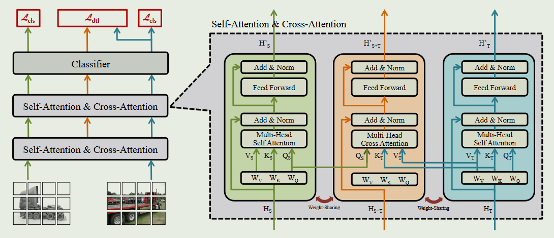 源分支( HS )和目标分支( HT )采用交叉熵,源-目标分支( HS + T )和HT之间采用蒸馏损失$L_{dtl}=\sum_kq_k\log p_k$