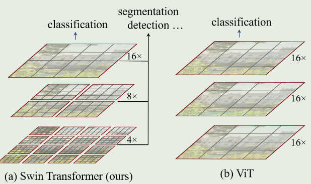 Swin Transformer使用了类似的” Patchify “层,但是具有更小的Patch size 4以适应架构的多级设计
