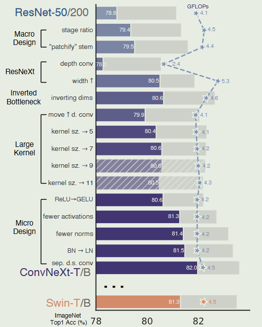 1 )marco design,2 ) ResNeXt,3 )inverted- bottleneck,4 )大核尺寸,5 )各种layer-wise的mirco design.
