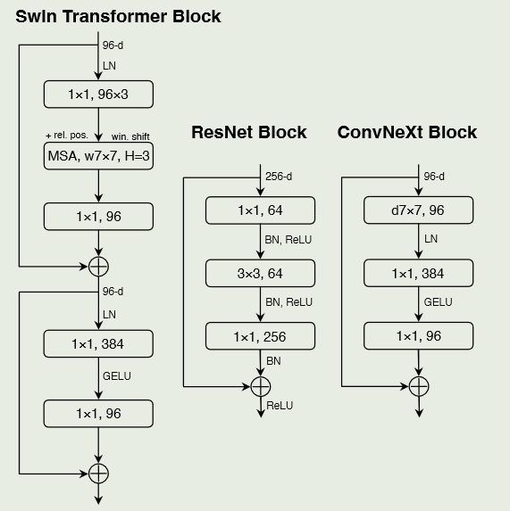 每个块的归一化层数甚至比Transformers还要少,因为从经验上发现在块的开头增加一个BN层并不能提高性能