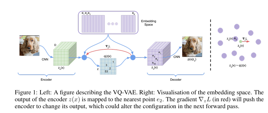Z~e~(x)是编码器网络的输出,根据这个输出通过找到最近邻映射到给定的潜在空间中,得到z~q~(x)作为decoder的输入.