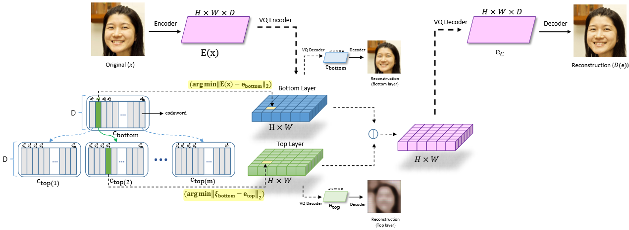 底层和顶层分别被压缩为大小为64 × 64和32 × 32的quantized latent图,相当于使用了不同尺度、多尺度的codelayer/codebook,再将不同尺度的codelayer通过多个decoder. 令分辨率最大的为bottom layer,不断降低分辨率并设置与encoder-decoder对数目对应的codelayer,得到多个H*W*1的量化结果,将上一层得到的量化结果通过decoder解码后的结果并上采样(增加特征图大小)与当前层量化的结果concat通过当前的decoder得到结果. 最后结果取bottom layer也就是分辨率最高那一层的解码结果,相当于实现了pyramid的多尺度,更新codelayer权重有两种方式,一种是使用stop gradient,在代码层面上使用.detach(),另一种通过ema.