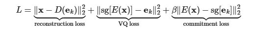 总损失如下,有三个组成部分,分别用于训练VQ-VAE的不同部分.