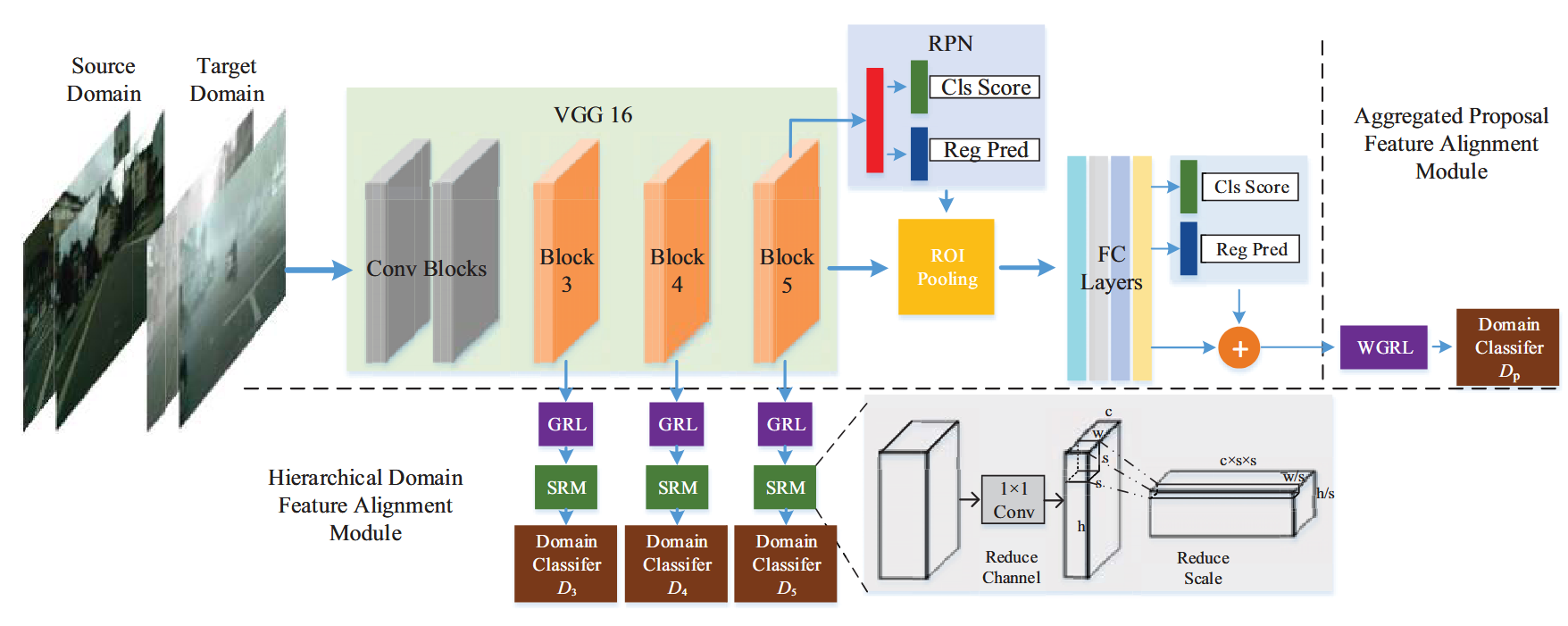 除了不同领域的图像级全局差异外,不同领域的物体在外观、大小、颜色等方面也可能存在差异。将Faster R - CNN中ROI Pooling层之后的每个候选区域定义为一个潜在的对象。与图像级自适应模块类似,通过ROI池化获得目标级域表示后,我们实现了一个目标级域分类器来识别局部信息中的特征衍生。一个训练有素的对象级分类器,一个具有3个全连接层的神经网络,将有助于对齐对象级特征分布。