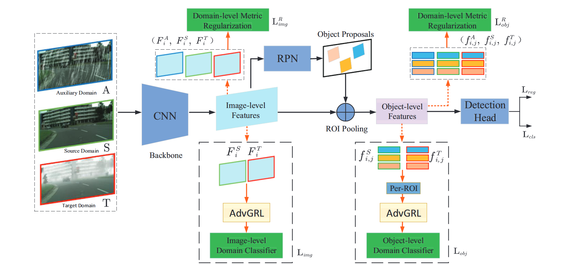 我们的方法同时利用图像级和对象级的自适应来减少图像风格和对象外观的领域差异。