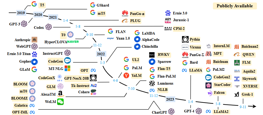 LLM 经过漫长的发展才达到了目前的状态:通用的、有能力的学习者。在发展过程中,人们提出了许多重要技术,这些技术在很大程度上提高了 LLM 的能力,包括scaling,training,ability eliciting,Alignment tuning等等.