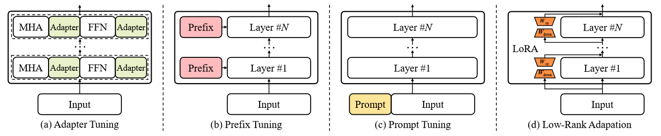Prefix Tuning在语言模型的每个transformer层中预置一系列前缀,这些前缀是一组可训练的连续向量.这些前缀向量是针对特定任务的,可视为虚拟标记嵌入。为了优化前缀向量,有人提出了一种重参数化技巧 ,即学习一个 MLP 函数,将一个较小的矩阵映射到前缀的参数矩阵,而不是直接优化前缀。